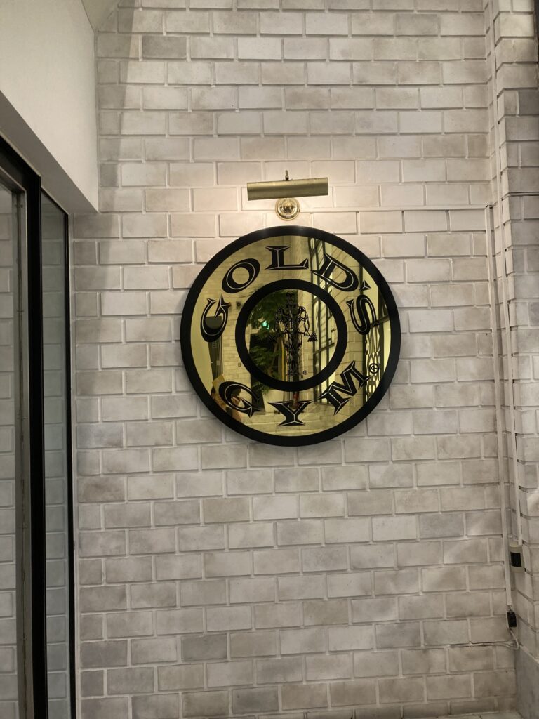 ピカピカに磨かれたゴールドジムの、んー、看板?